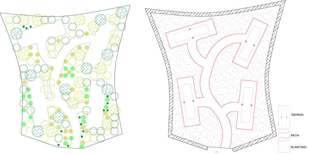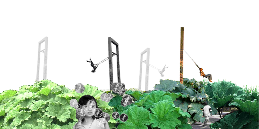 Wandering, playing hide and seek, swinging high up. Climbing up a tree house… One does not simply play in this garden; one gets taken in, immersed. The garden is active and playful. It invites us and offers hiding places and surprises. As Alice in Wonderland falling down the endless tunnel, one would experience effects of scale, a distortion of time, and a loss of references. The garden is a green maze of large leafed spectacular plants: gunnera, tetrapax, astilboides. One is lost within a dense green mass. A small irregular path wanders through. The horizon is obstructed, close, green and dense. We are immersed. A small voice whispers in our ear: 1,2,3 here I come… It is an invitation to play hide and seek.