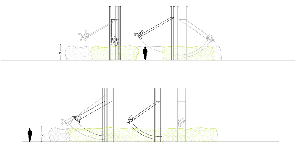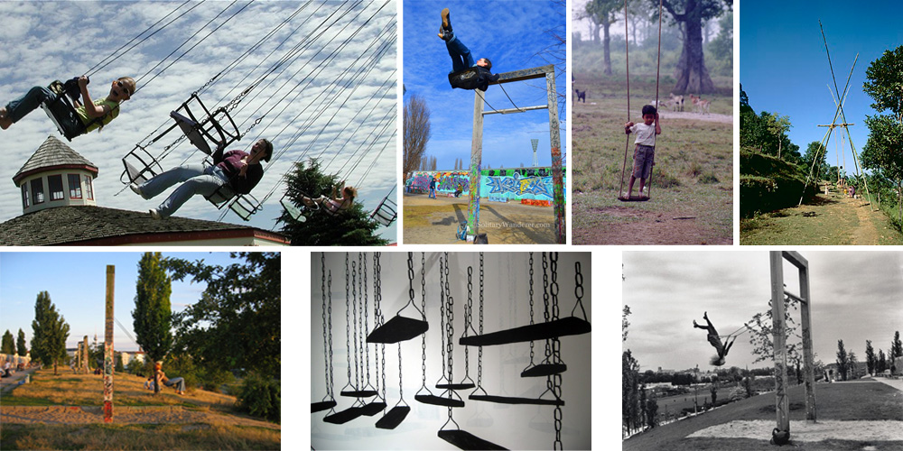 Lifting our heads… High swings stand out from the green mass, high colored poles. Their swinging paths cross in a light ballet on top of the garden. We call each other from a distance, we appear and disappear.