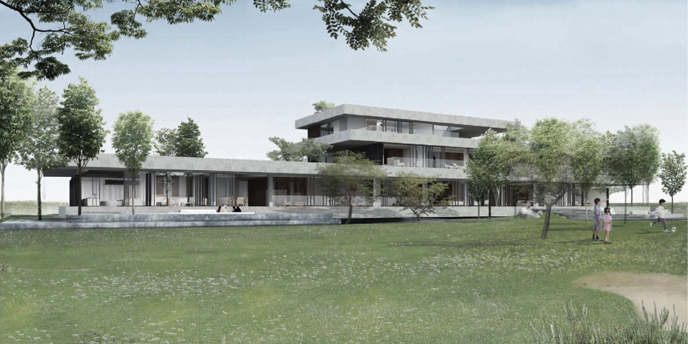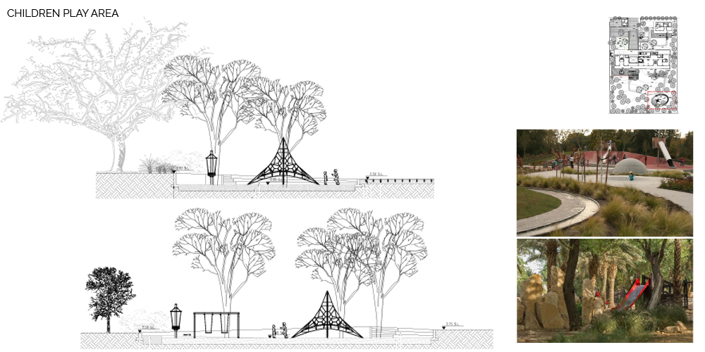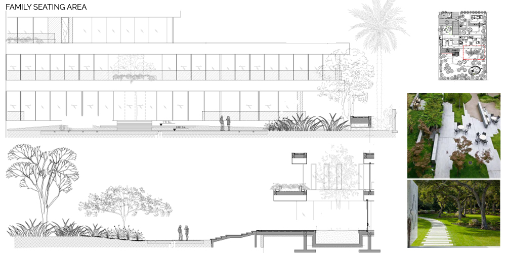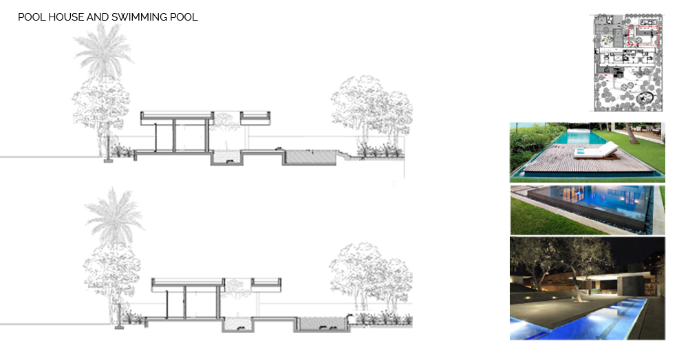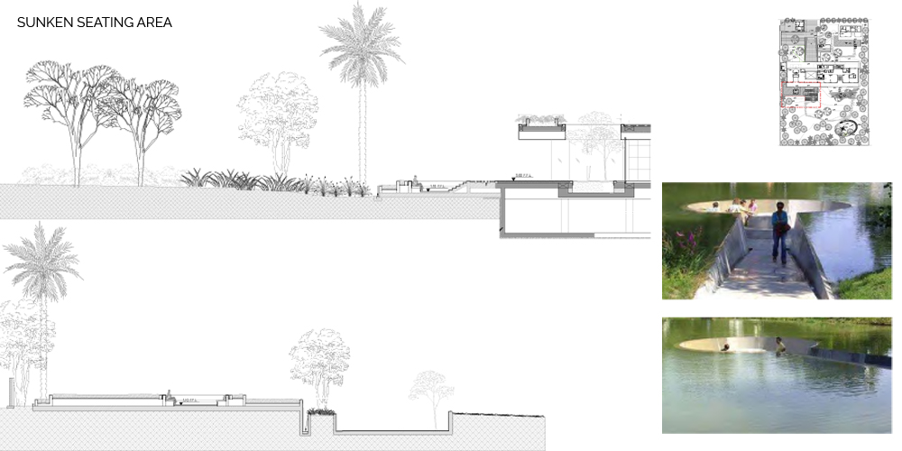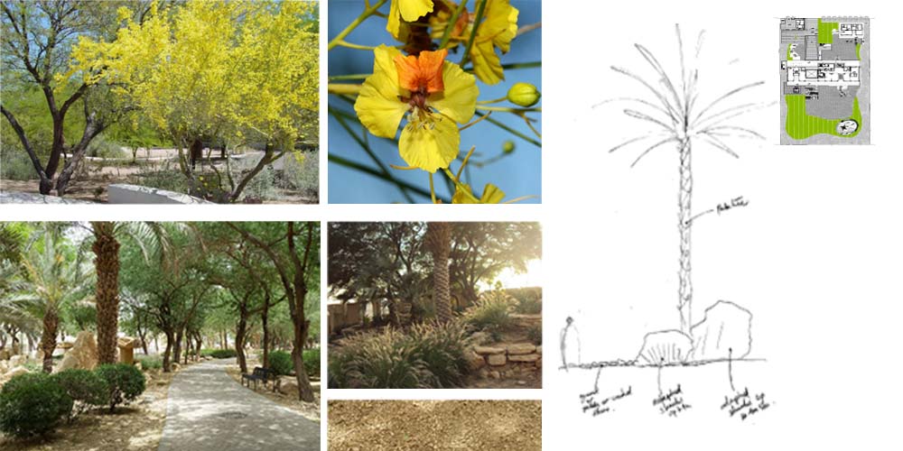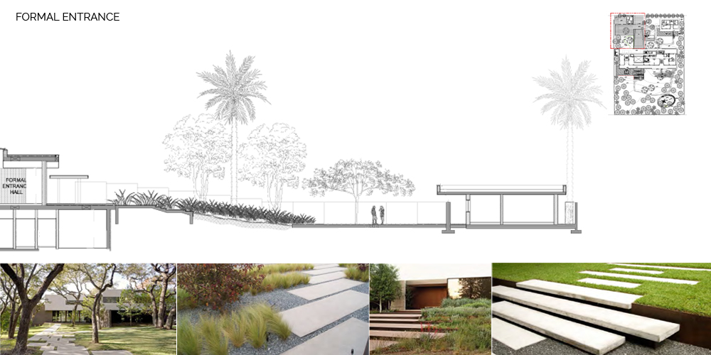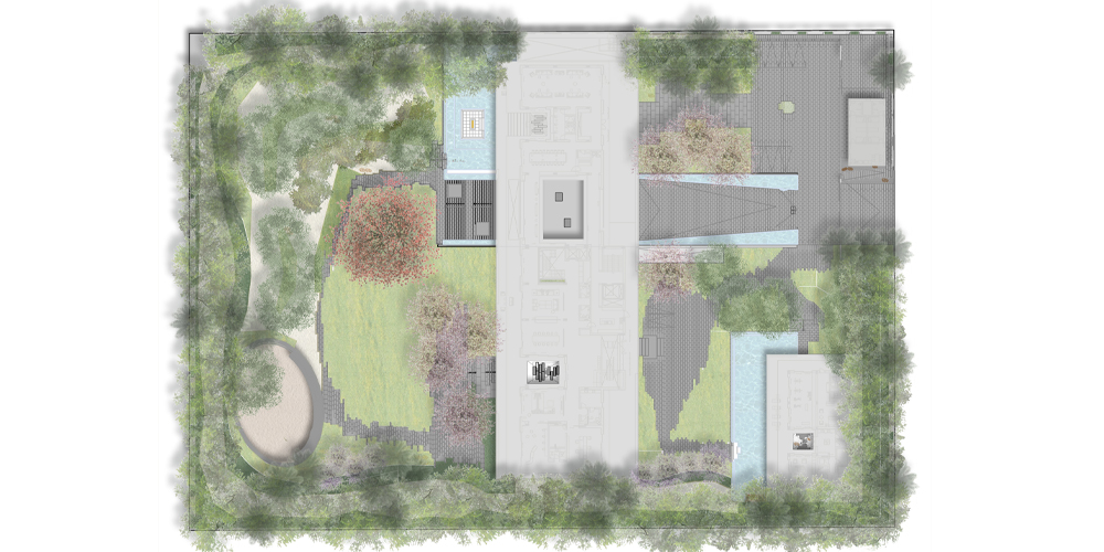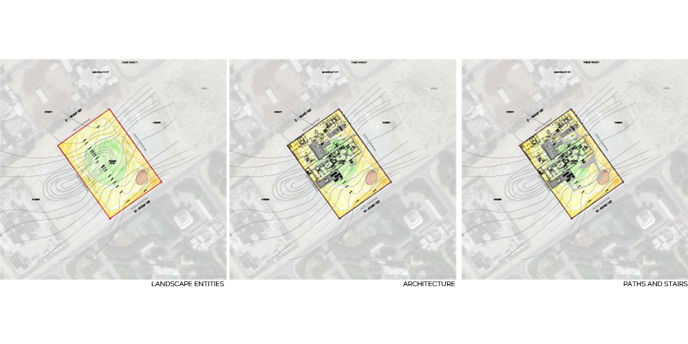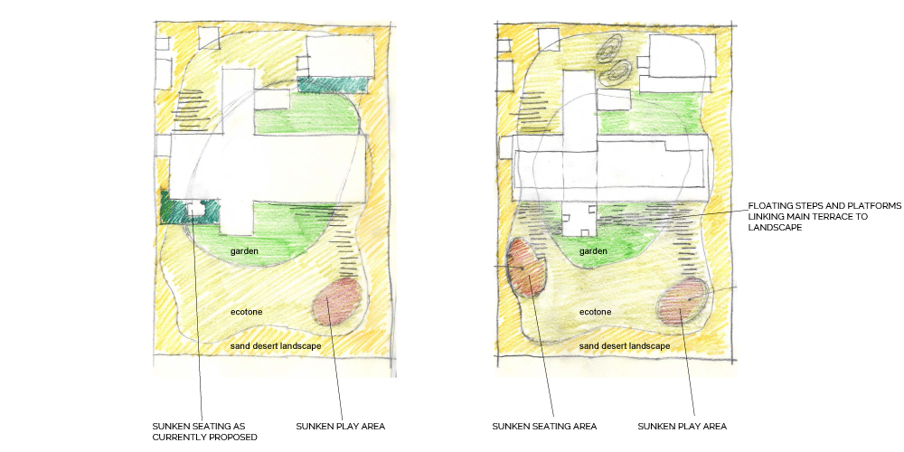 The site seems to have been a rain water catchment area, between 2000 and 2012, there seems to have been the start of a rich plant community with different layers of vegetation. This would be explained by the topography of the site with a sunken area at the center. We think this is an interesting starting point. The center of the site is the area with the highest level of moisture, and the site gets drier as we move towards the edges. This specificity of the site is the starting point to our landscape proposal. The proposed landscape plan includes a differentiation in the landscape entities. This translates in the implementation of three distinct zones starting with the peripheral area which presents a ‘sand desert landscape’, the ecotone which is a transitional area, and the ‘garden’, which is the highly maintained zone at the center/lowest point. The three proposed landscape typologies are also based on water consumption. The sand desert landscape requires no irrigation after establishment. The ecotone, transitional area, requires minimal to moderate irrigation, and the ‘garden’ requires high irrigation. The architecture is another layer of the site. It is laid on top of the topography with a minimum of cut and fill. Floating steps and platforms link the main terrace to the garden level. The fence is invisible behind a dense peripheral buffer zone composed by native species.