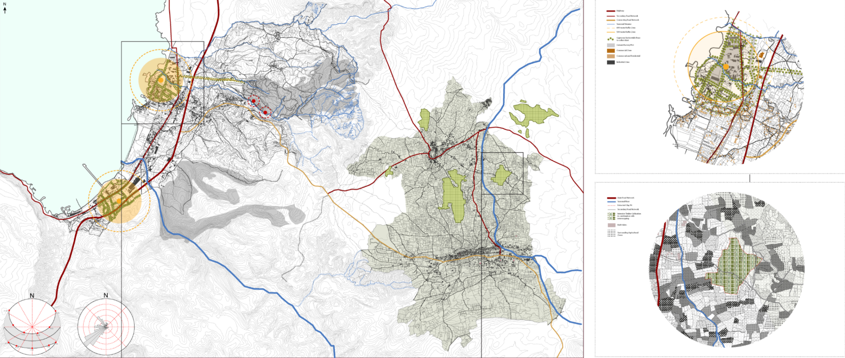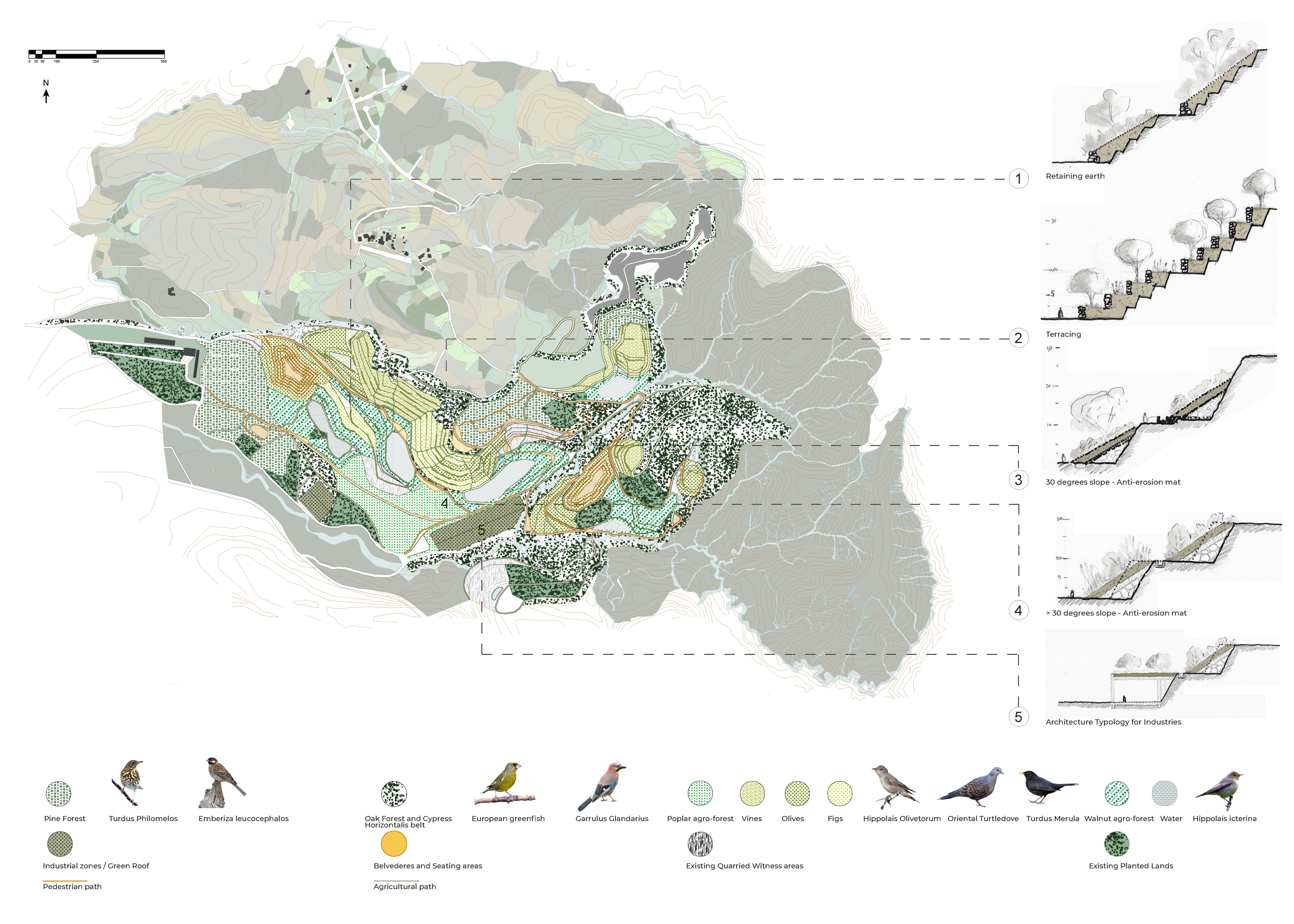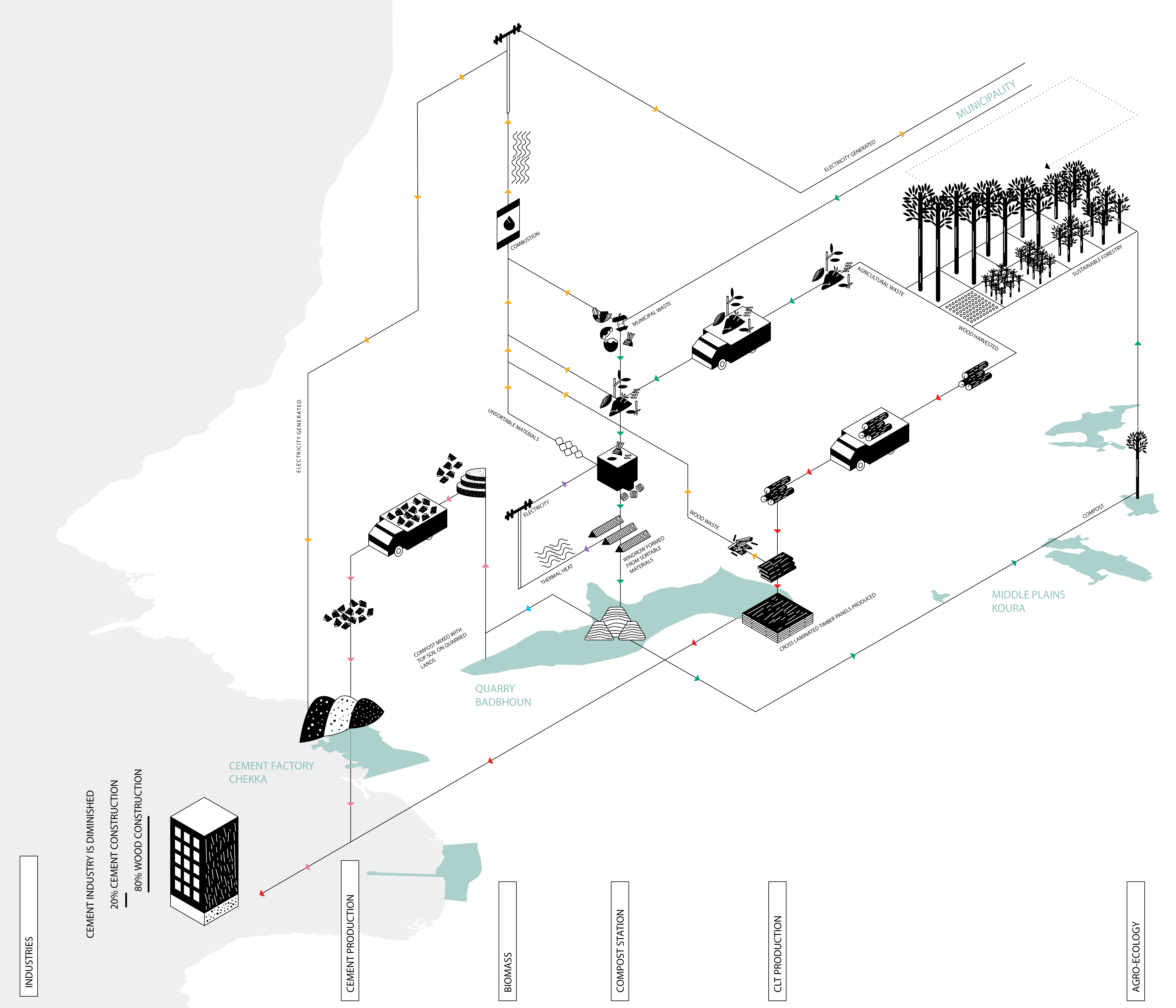 Afforesting the existing terraced slopes, flat areas and clay pits with pine and poplar will participate in the healing of the soil. We propose a grid of 5m, to host intercropping, which benefits the local community within shorter cycles. The first crop of trees will set in motion a new industry based on the production of Cross Laminated Timber and other wood products and by-products, slowly proposing local alternatives to the use of concrete in the building industry. Waste produced along the process and available biomass are reused for compost or for the production of biofuel.