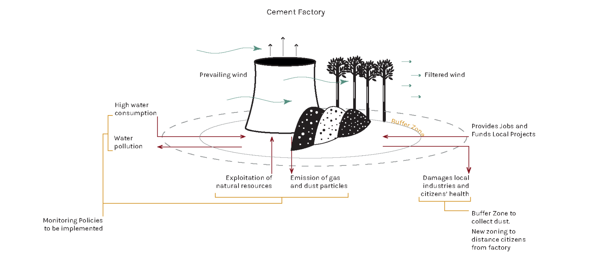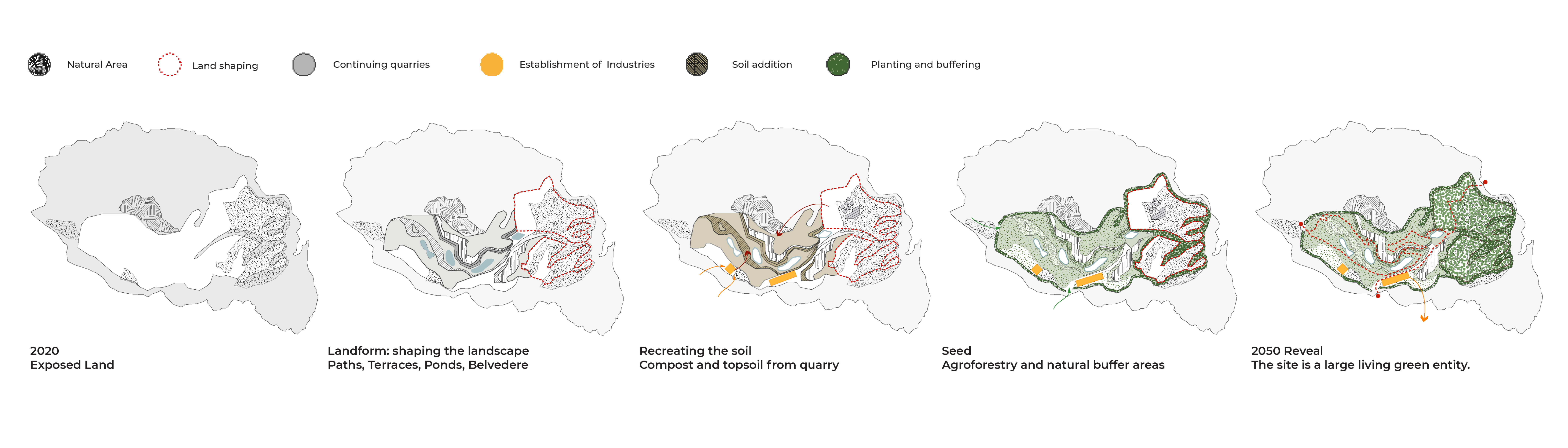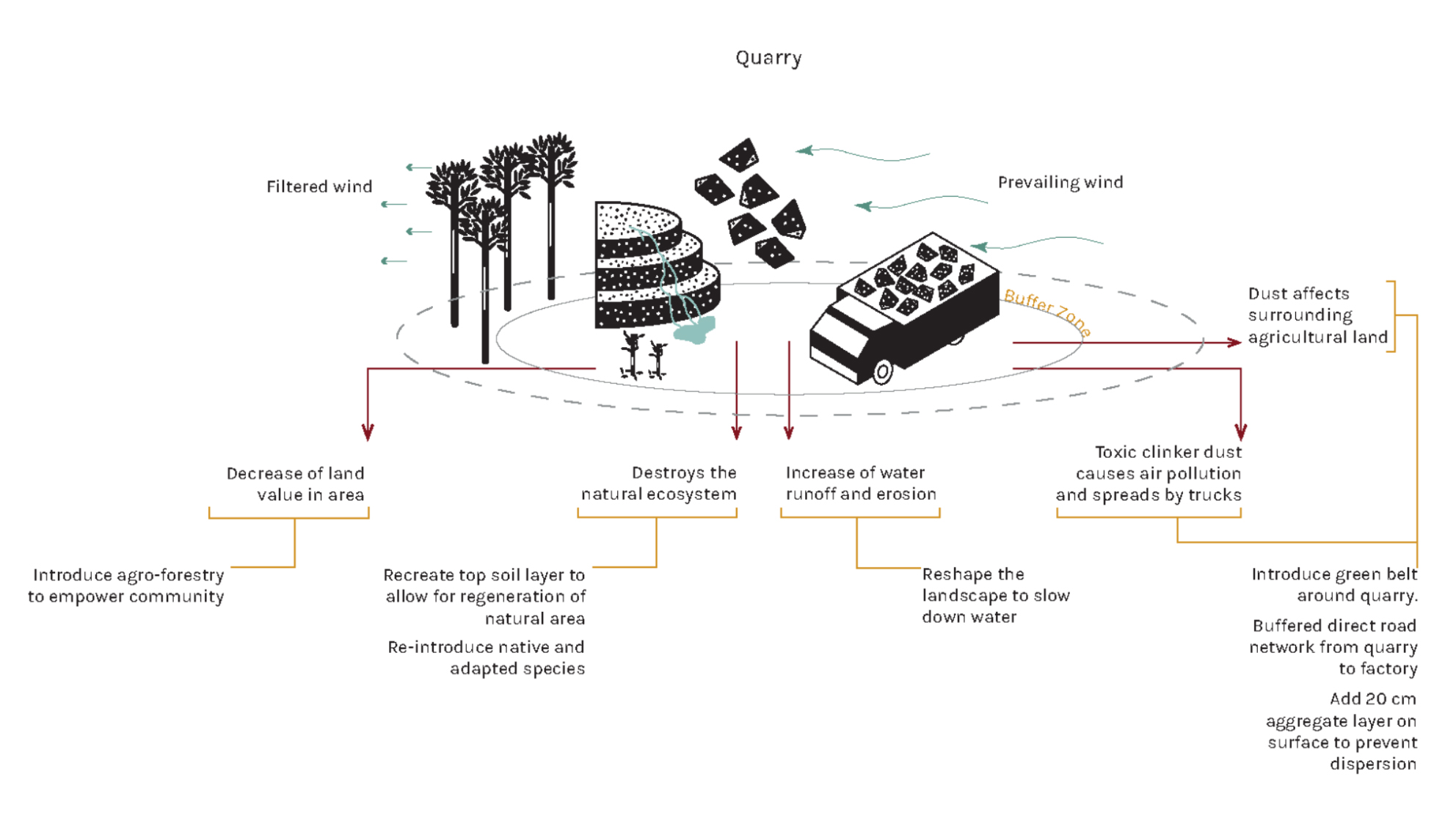 Cement extraction sites constitute unique settings with many opportunities, yet they raise complex questions regarding long-term recovery. Our general approach is to re-weave the geography using a system of agroforestry managed by local cooperatives. Based on a circular economy and sustainable harvesting, rehabilitation through agroforestry centers the intricate relation between plants, animals, humans and the environment.