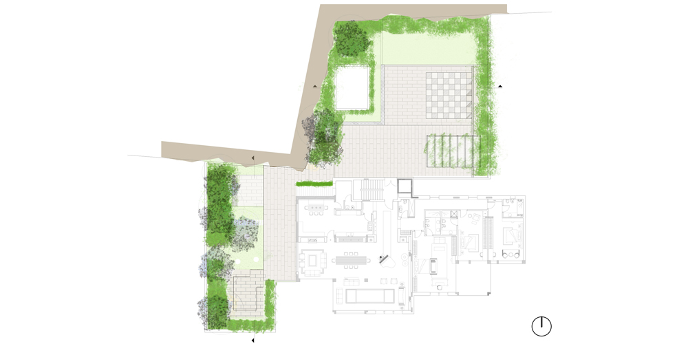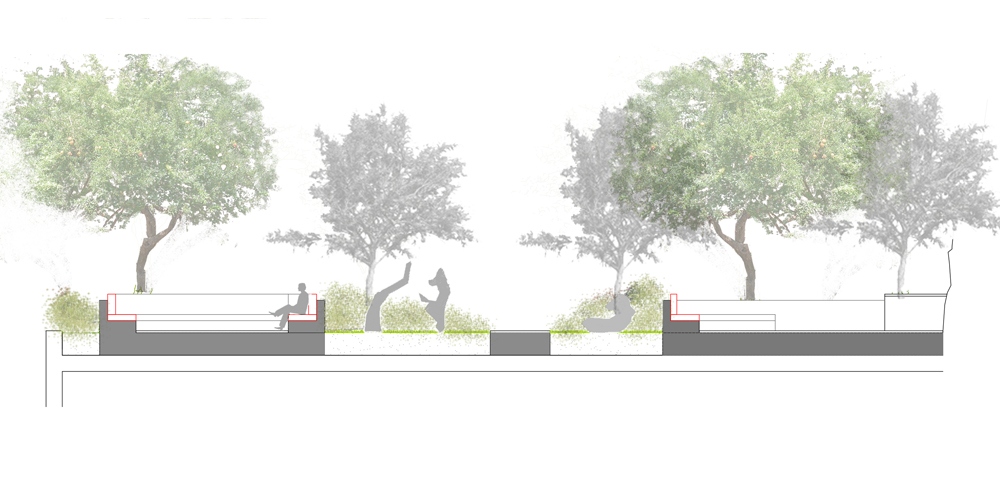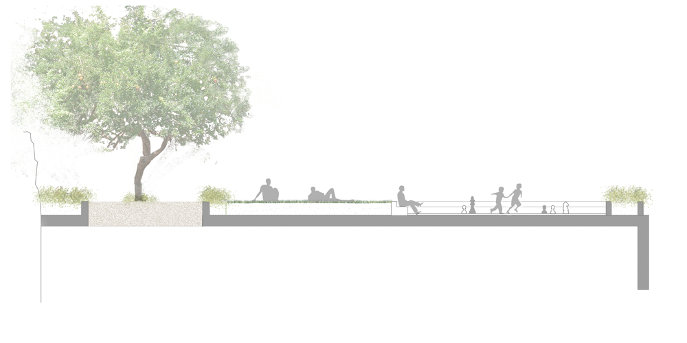 The concept is based on an opposition between hardscape and softscape : on the terrace above the parking we are including a one lawn square within a large open hardscaped area. On the ‘garden’ side, the dominant element is the ‘green’, and seating areas are small insertions within it. In both cases seating areas are placed in a way to benefit from the existing views.