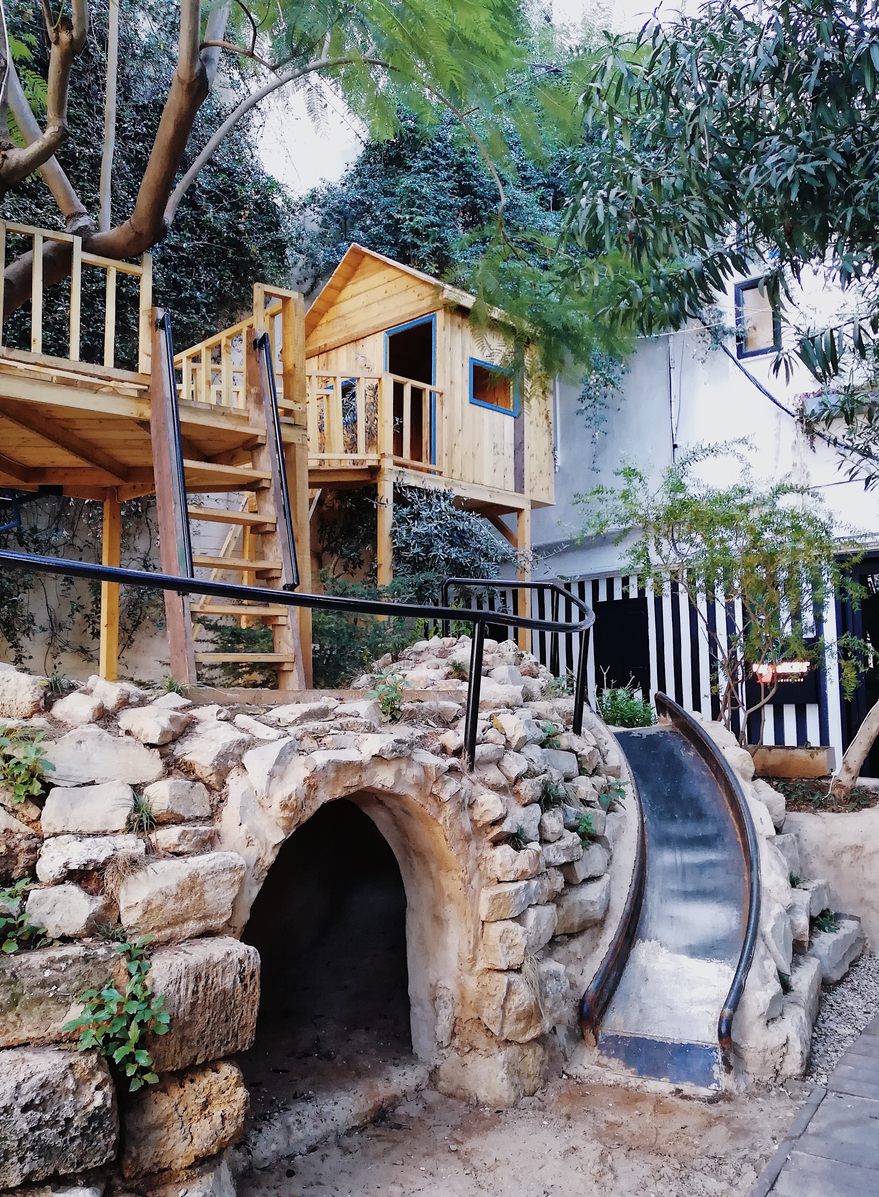 Despite its small scale, this playground was designed as a place of adventure: tunnel, tree houses, slides, water pump are as many elements that participate to turning this space into a playground where children can keep busy for a while. Within dense Beirut, this is a breather. We were happy and honored to be part of this project.
